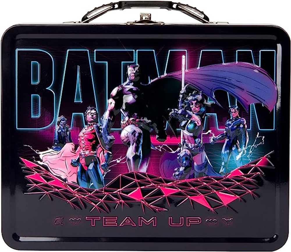 Join the team for a healthy lunch with this officially licensed Batman Neon Outrun Tin Lunchbox. This Batman Lunchbox is made from tin and features a futuristic Neon Outrun and Team Batman design