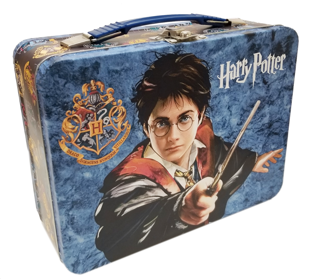 Let Harry Potter protect your lunch with this great looking metal lunchbox. Front and backside shows Harry with his magic wand along with the Hogwarts crest. Sideband has the crests of the houses - Gryffindor, Hufflepuff, Ravenclaw, and Slytherin. Perfect for carrying your lunch to school and work, or as a collectible or keepsake box