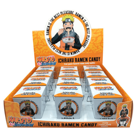Ichiraku's favorite ramen, now in a candy form! One ounce of fruit punch flavored candy ramen "noodles" are a fun collectible packaged in a takeout shaped tin. Packed 12 per display.